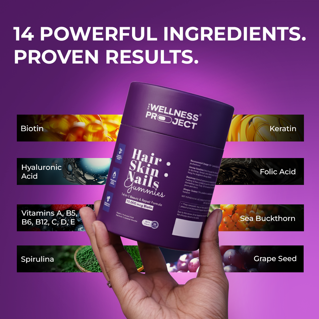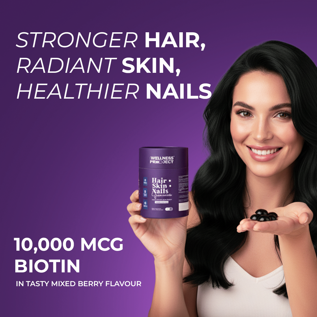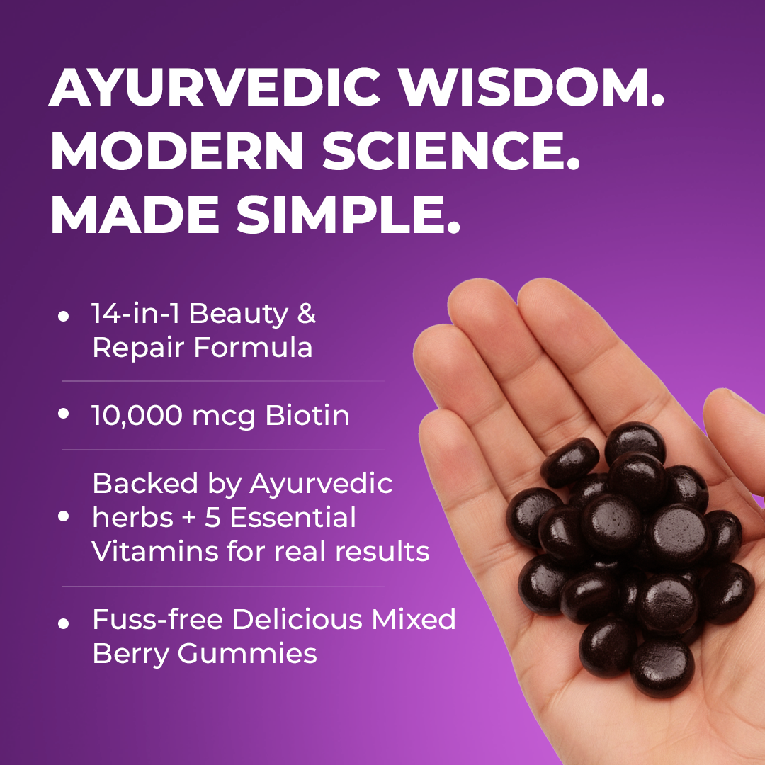Say goodbye to juggling multiple supplements. These Hair, Skin & Nail Gummies are a 14-in-1 beauty and repair powerhouse, crafted to give you thicker & glossy hair, radiant & dewy skin, and nails that are strong & flawless, all in one delicious mixed berry-flavored gummy. Packed with 10,000 mcg Biotin, Keratin, Hyaluronic Acid, Folic Acid, and 5 essential vitamins, that nourish from within, boosts hair growth, restore deep hydration, strengthen nails, and enhance your natural glow, delivering visible, confidence-boosting results. Gluten-free, sugar-free, and crafted with centuries of natural and ayurvedic wisdom and validated by modern science, these gummies make your daily beauty ritual effortless, indulgent, and transformative. Just one gummy a day simplifies your routine while giving you complete, all-in-one beauty, so you’re not just maintaining your hair, skin, and nails, you’re owning your confidence and radiance.