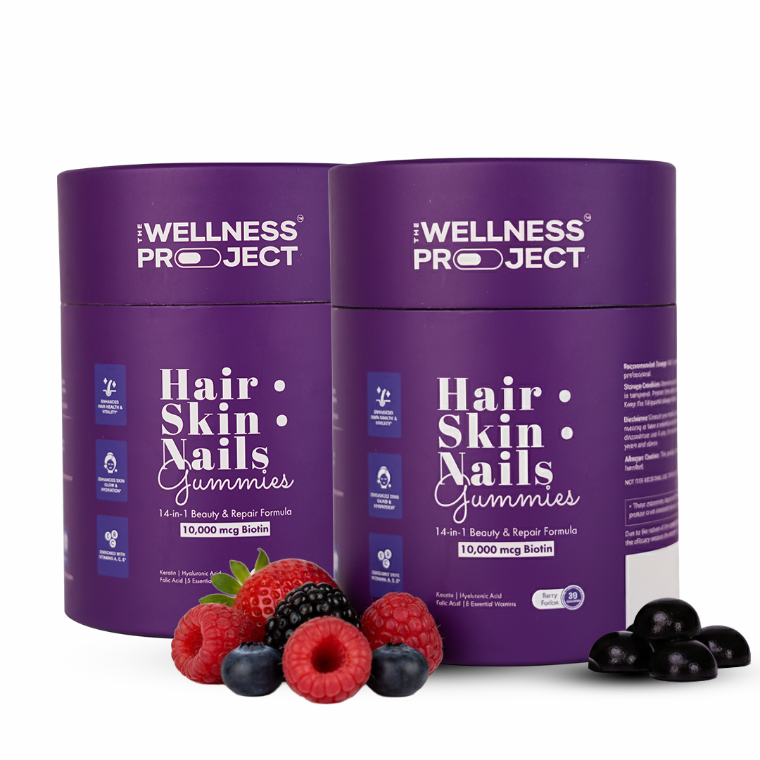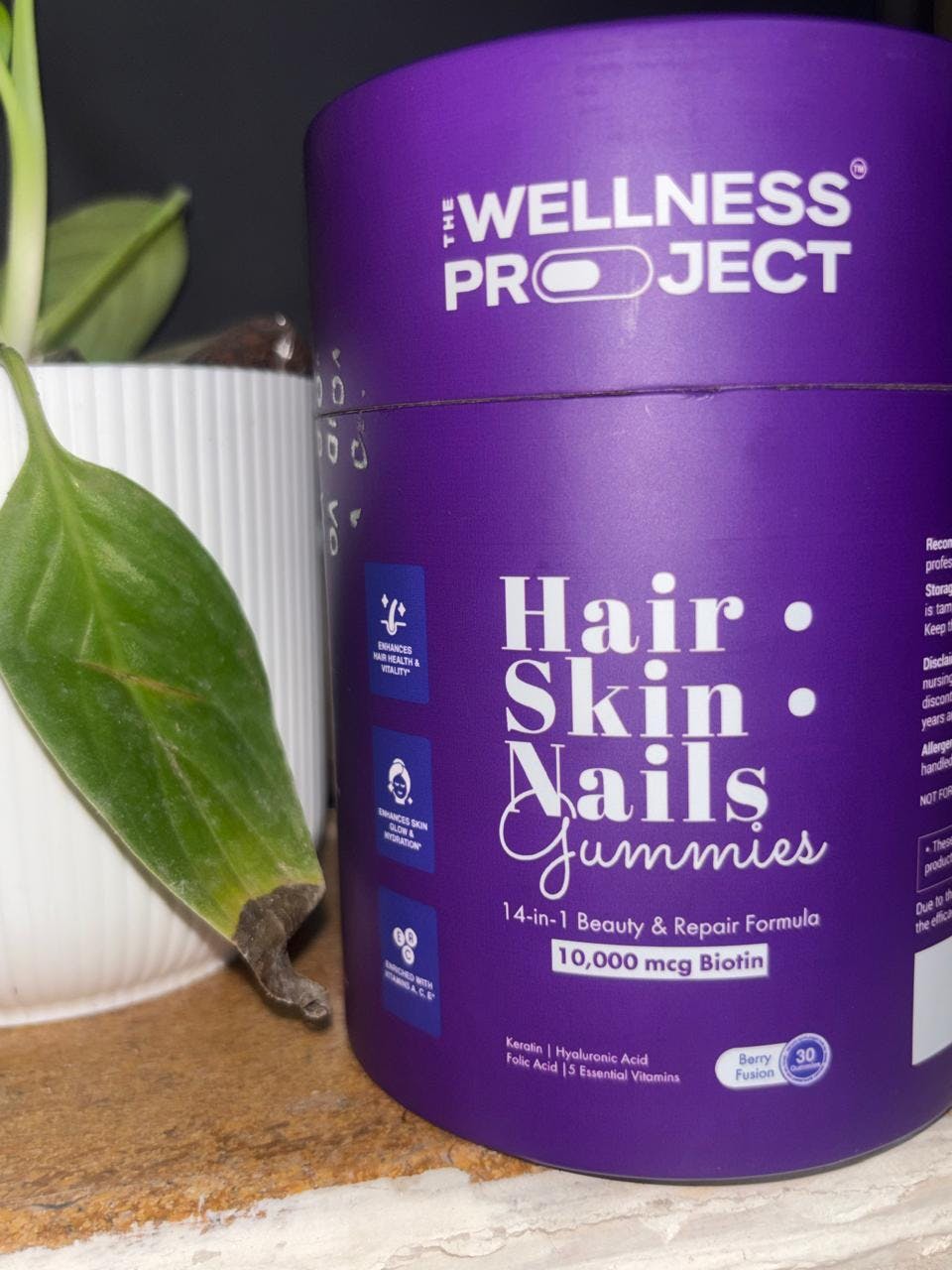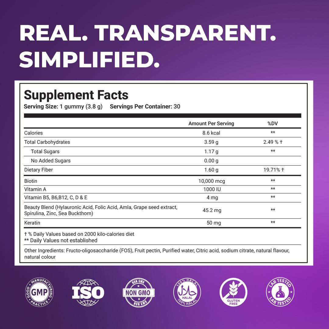 Say goodbye to juggling multiple supplements. These Hair, Skin & Nail Gummies are a 14-in-1 beauty and repair powerhouse, crafted to give you thicker & glossy hair, radiant & dewy skin, and nails that are strong & flawless, all in one delicious mixed berry-flavored gummy. Packed with 10,000 mcg Biotin, Keratin, Hyaluronic Acid, Folic Acid, and 5 essential vitamins, that nourish from within, boosts hair growth, restore deep hydration, strengthen nails, and enhance your natural glow, delivering visible, confidence-boosting results. Gluten-free, sugar-free, and crafted with centuries of natural and ayurvedic wisdom and validated by modern science, these gummies make your daily beauty ritual effortless, indulgent, and transformative. Just one gummy a day simplifies your routine while giving you complete, all-in-one beauty, so you’re not just maintaining your hair, skin, and nails, you’re owning your confidence and radiance.