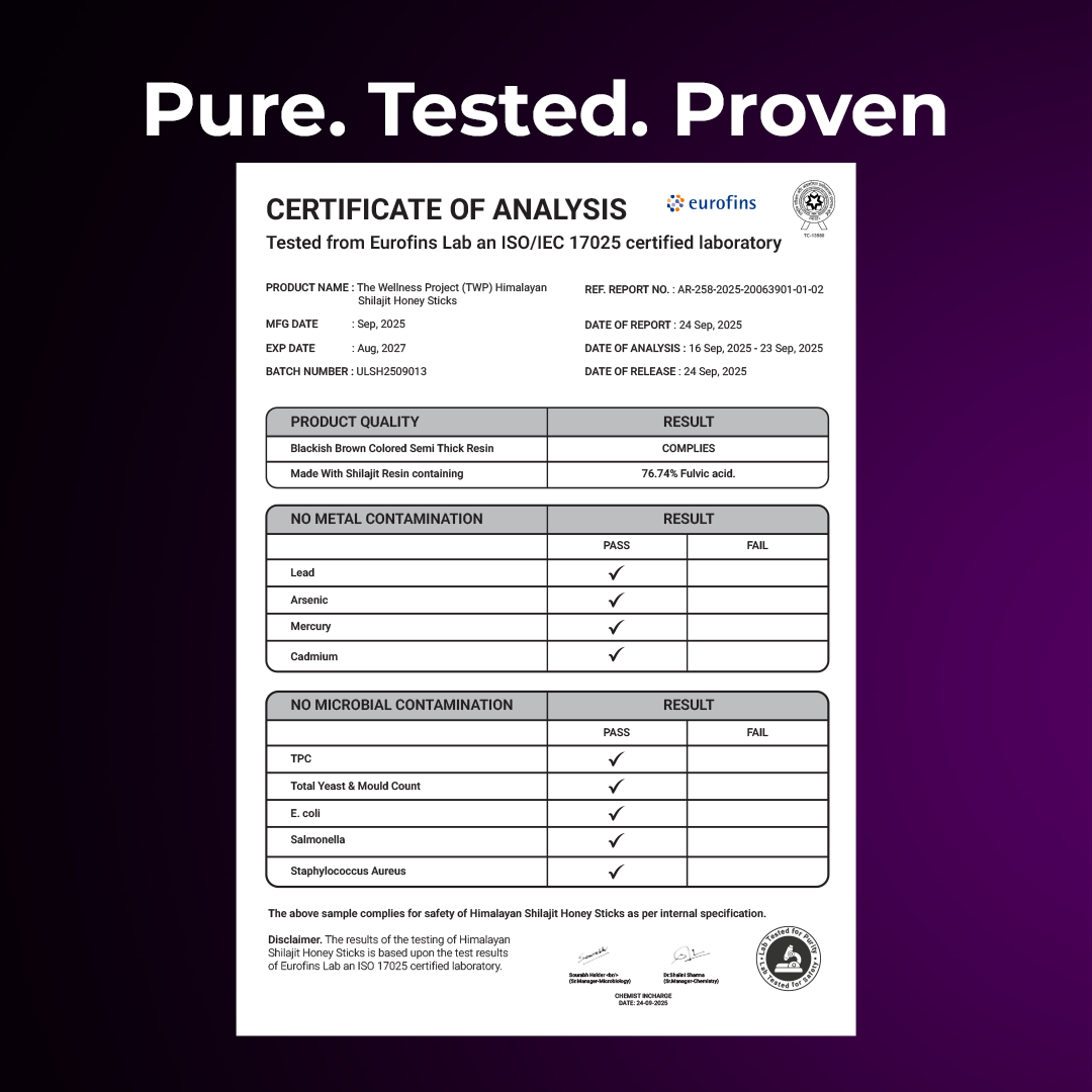 Each honey stick contains lab-tested Himalayan Shilajit, in the purest and most potent form.