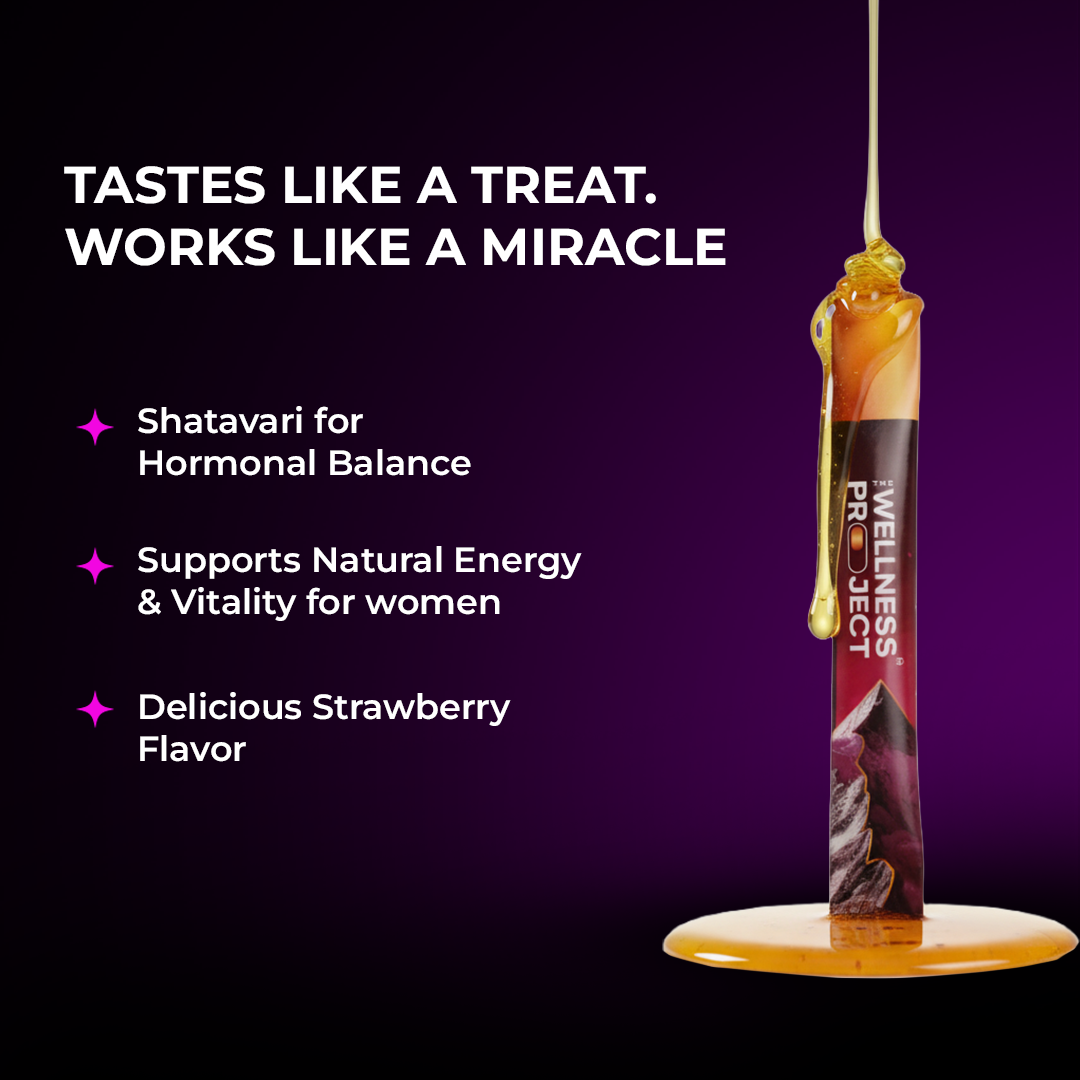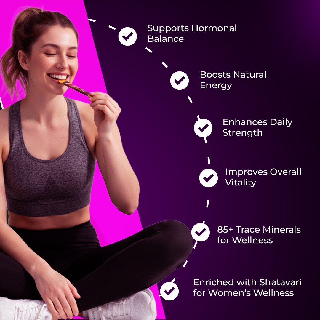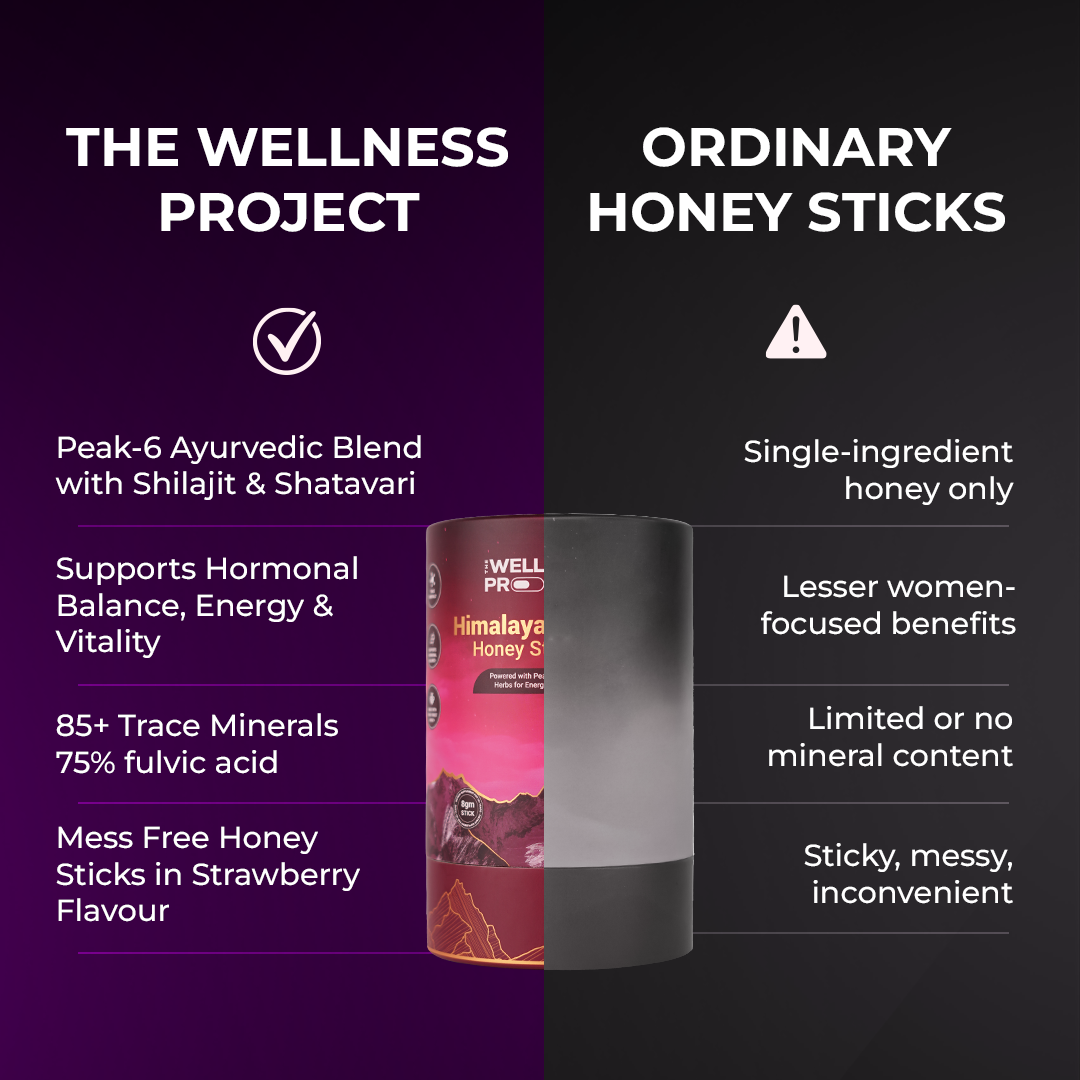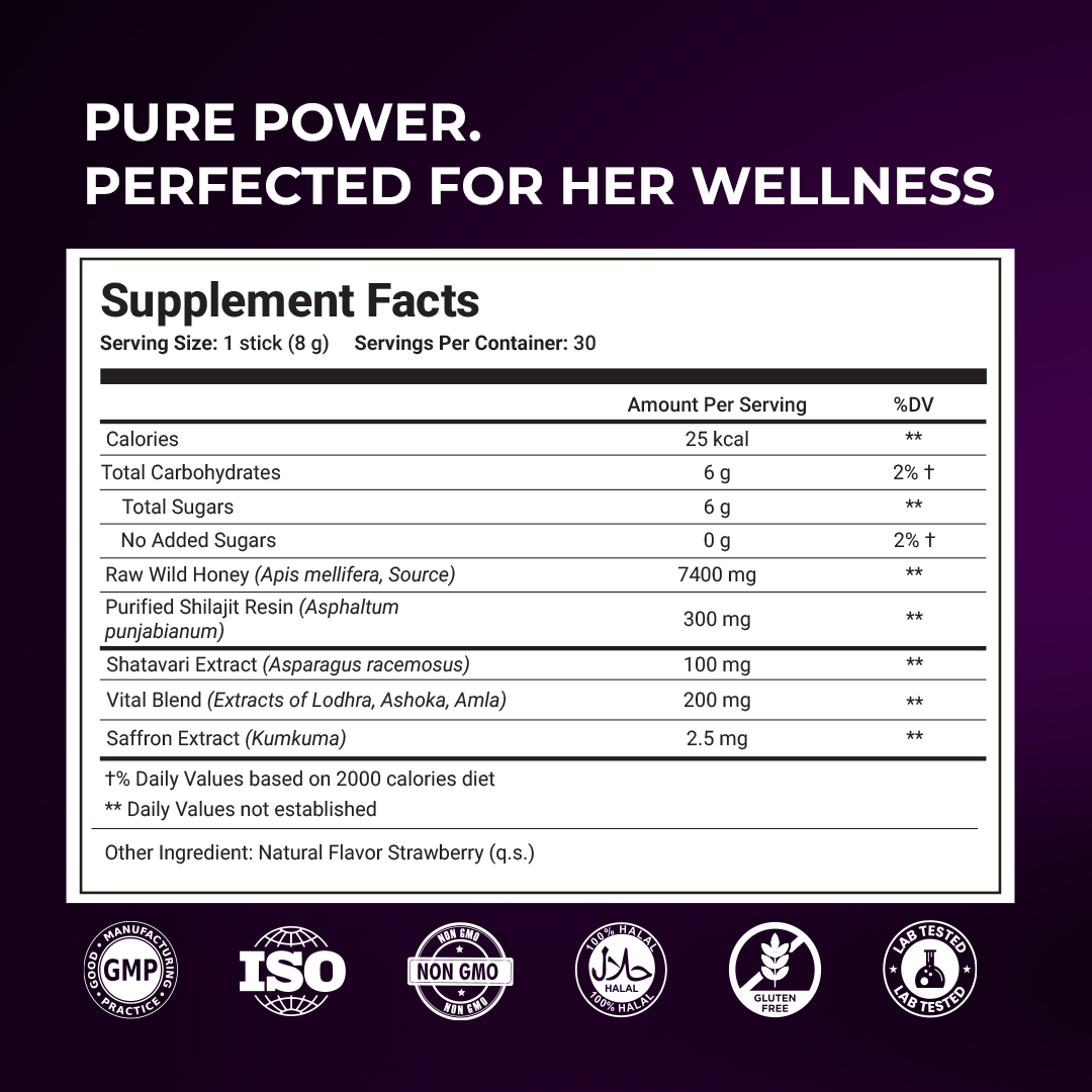 Power your day with Himalayan Shilajit Honey Sticks Pro. Crafted for women who want natural energy, hormonal balance, and lasting vitality in a single, indulgent stick. Each stick blends the purest lab-tested Himalayan Shilajit with Shatavari & other 4 vital Ayurvedic Herbs, and pure forest honey, giving you a smooth, sweet strawberry flavor with no bitter aftertaste. With 85+ essential trace minerals, these sticks boost energy, enhance stamina, support hormonal balance, and nourish your body from within. Mess-free, sugar-free, and travel-friendly, each stick is perfect to enjoy directly or stirred into warm tea or milk for a quick, convenient, and delicious wellness boost anytime. Made with Ayurvedic wisdom validated by modern science, these honey sticks restore your energy, balance your hormones, and promote overall vitality. One stick a day keeps you feeling confident, vibrant, and unstoppable, ready to own your day with strength and sweetness.