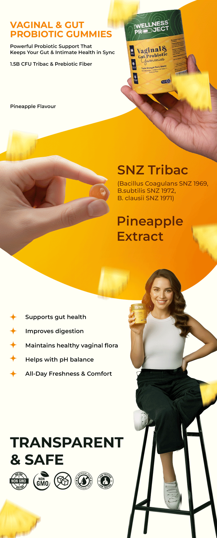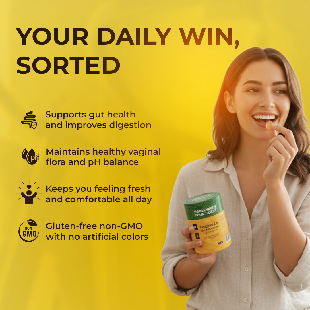 Take care of your body from the inside out with Vaginal & Gut Probiotic Gummies. These pineapple-flavored gummies are designed for women who want balance, comfort, and confidence from the inside out. Each gummy delivers 1.5 Billion CFU Tribac probiotics and prebiotic fiber to support vaginal health, pH balance, digestion, and overall gut wellness. The naturally sweet pineapple flavor turns daily self-care into a delightful ritual, while the convenient gummy form slips effortlessly into any routine. Gluten-free, non-GMO, and crafted for superior absorption, these gummies help restore natural balance, reduce discomfort, and support daily freshness and intimate comfort. One gummy a day empowers you to feel lighter, revitalized, and confident every single day
